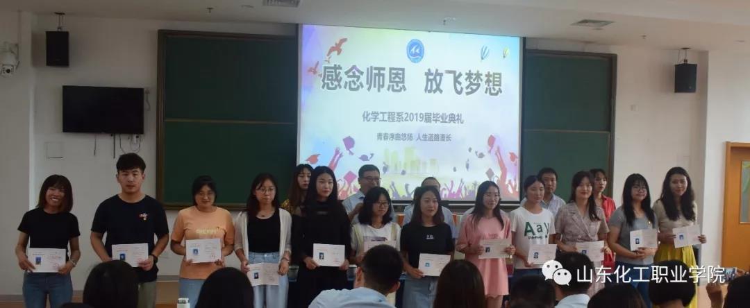 本次毕业典礼共有十项。第一项,全体起立奏唱国歌。第二项,化学工程系各位领导为优秀毕业生颁奖并合影留念。第三项,化学工程系主任冯喜成为所有毕业生颁发毕业证书并合影留念。第四项,预备党员宣誓,化学工程系党支部副书记黄语涵领誓,11名预备党员庄严宣誓。第五项,播放视频,在场的员工通过视频回忆了过去三年的点点滴滴,激动处掌声不断,将典礼气氛推向了高潮。第六项,毕业生代表发言,2019届毕业生代表张戈发言。第七项,在校生代表、2018级员工刘潇檀为即将远行的学哥学姐们送上临别祝福。第八项,教师代表韩晓琳老师发言,表达对同学们的眷恋之情。第九项,冯喜成主任致辞,对全体毕业生顺利完成学业表示衷心的祝贺,并祝全体毕业生前程似锦,一帆风顺。第十项,“毕业惜别,感恩母校”捐书活动,倡导毕业生为母校留下一份爱。