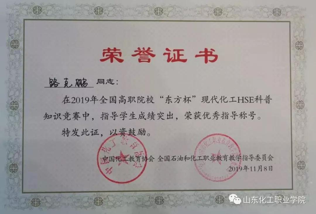 化学工程系为在全体教师和员工中推行现代化工健康、安全、环保理念,学习普及HSE知识技能,积极组队参加2019年全国高职院校现代化工HSE科普知识竞赛。在接到比赛通知后,化学工程系先后组织200余名员工进行了多次上机比赛,初选选拔出70名员工,然后进行闭卷考试,最终精心选拔出3名员工代表学院参赛。为了备战比赛,从赛前一个月开始,每天员工和指导教师都要忙碌到晚上九点多,周末也不休息,最终在员工和老师的共同努力下,荣获全国高职院校现代化工HSE科普知识竞赛二等奖及优秀指导教师称号。