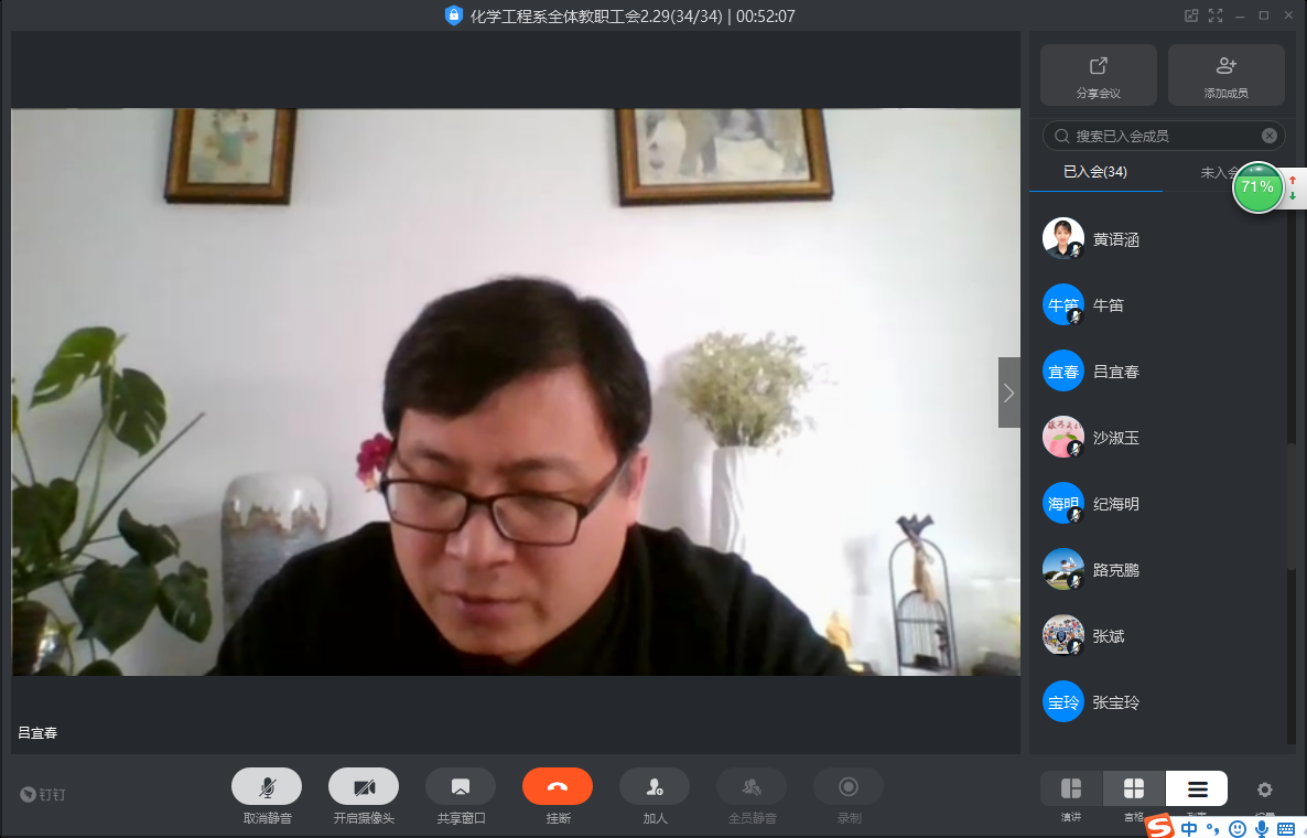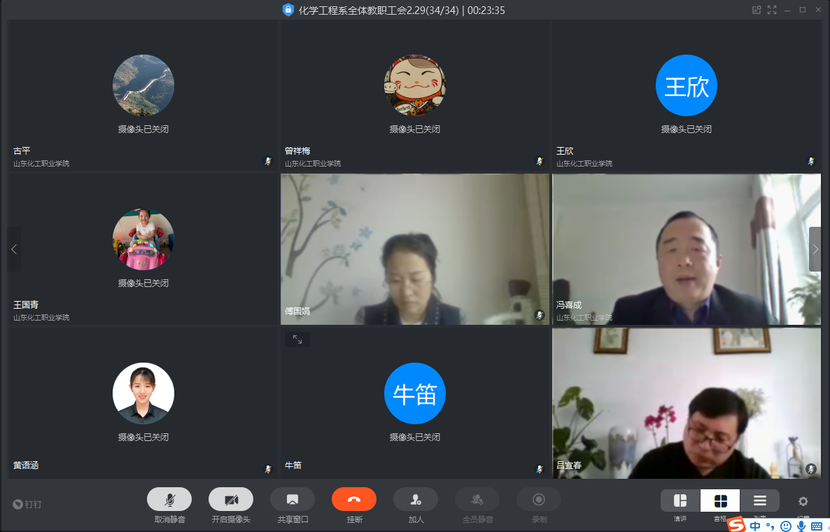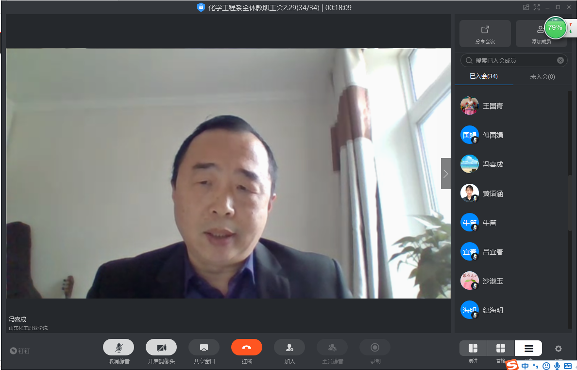 疫情防控特殊时期,为落实教育部、省教育厅有关停课不停教、停课不停学的文件精神和学院教学工作会议要求,2020年2月29日下午15时,化学工程系召开全体教职工视频会议,对寒假期间相关工作进行总结,并且对新学期疫情期间的线上教学和员工管理等工作进一步提出要求。本次会议由党支部书记宋美庆主持,冯喜成主任、吕宜春副主任、黄语涵副书记及全体教职工参加。