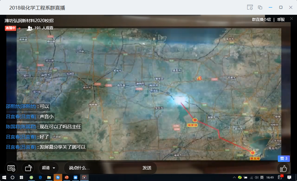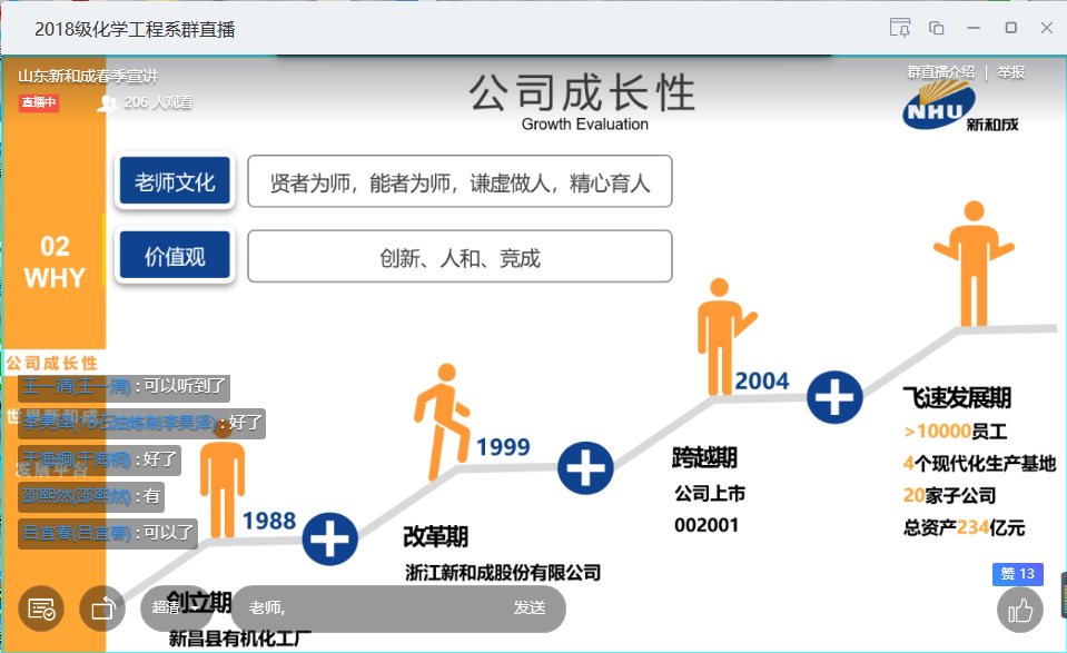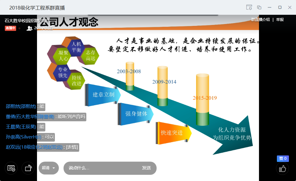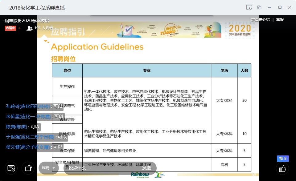 由于疫情防控特殊时期,公司的开学时间还不确定,为了不影响2018级员工的实习,为员工创造更多的实习和就业机会,减轻员工的焦躁情绪,在系领导积极联系和各位辅导员的精心组织下,4月15日下午,化学工程系通过网络平台举办了首期企业网上宣讲暨面试招聘会,2018级全体师生在线参加了本次宣讲会。