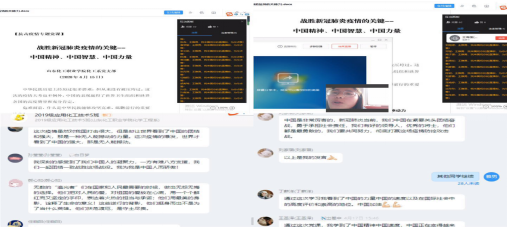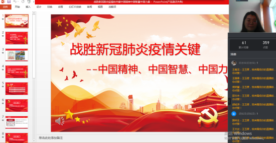 党员教师王玉君说:“这次新冠肺炎疫情大考,中国的表现赢得了世界卫生组织和世界各国的高度赞誉和充分肯定。这次疫情充分体现了我们国家的实力与韧性,彰显了党的领导和中国特色社会主义制度的显著优势。战无不胜的中国精神、中国智慧和中国力量是中国人民和中华民族的强劲武器,是中华民族能够攻坚克难、砥砺前行的重要法宝,能够为打赢疫情防控阻击战树立坚定信心。疫情虽未过去,胜利已经不远,希望同学们树立必胜信念,保持积极心态,坚定理想信念,担当时代使命,成为新时代最坚定的奋进者、开拓者、奉献者!”
