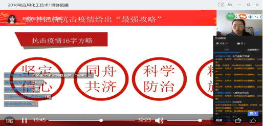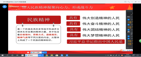 党员教师王雅男说:“4月18日下午,我对自己的党员负责区2019级应用化工技术5班上了一堂以‘为战胜新冠肺炎疫情的关键——中国精神、中国智慧、中国力量’为主题的党课,通过本次党课员工们看到了中国在疫情中展现出的国际大范儿,这次疫情虽然对我国打击很大,但是却让世界看到了中国的团结和强大,那是一种无人能撼动的力量。”