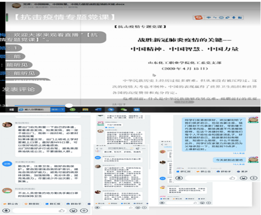 面对疫情,化学工程系党员教师们更是全面落实“坚定信心,同舟共济。上下同欲者胜,同舟共济者赢”的总要求,强化阵地意识,落实思想政治工作。化学工程系的党员导师牢记时代使命,守好责任田、做好引路人,以强烈的责任感和使命感,自觉加入这场伟大而特殊的战“疫”之中,走进班级,精准掌握员工动态,针对性地做好员工思想政治工作,在这场“疫”考中讲好了中国故事、传递了中国精神、展现了党员们的责任担当。