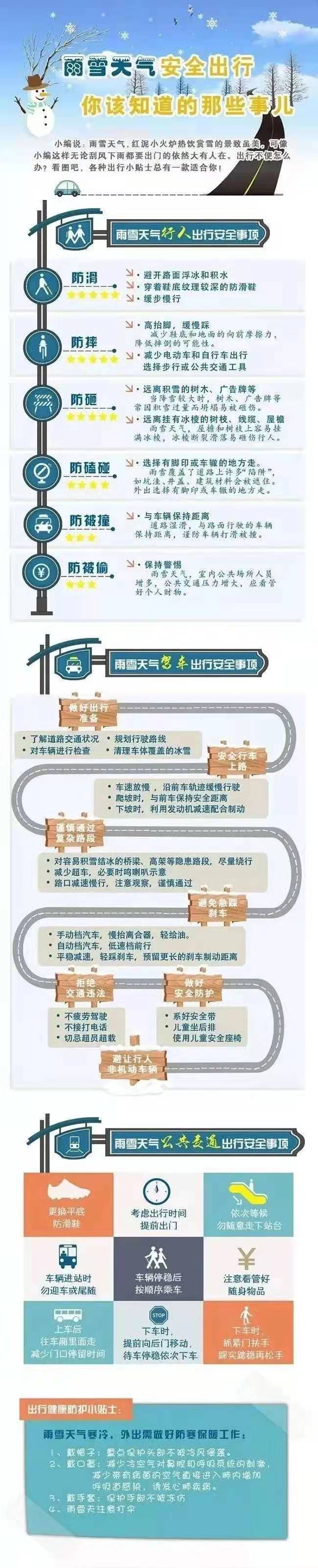 同学出行时,做好防寒保暖工作,保护好身体裸露在外的部位,防止受冻引发冻疮。不玩雪不玩水,防止因打湿衣服、鞋子而受冻受凉,预防感冒发生。冬季是流感等传染病高发期,如果出现发热、咳嗽、咽痛、全身酸痛等身体不适症状,应及时到医院就诊。