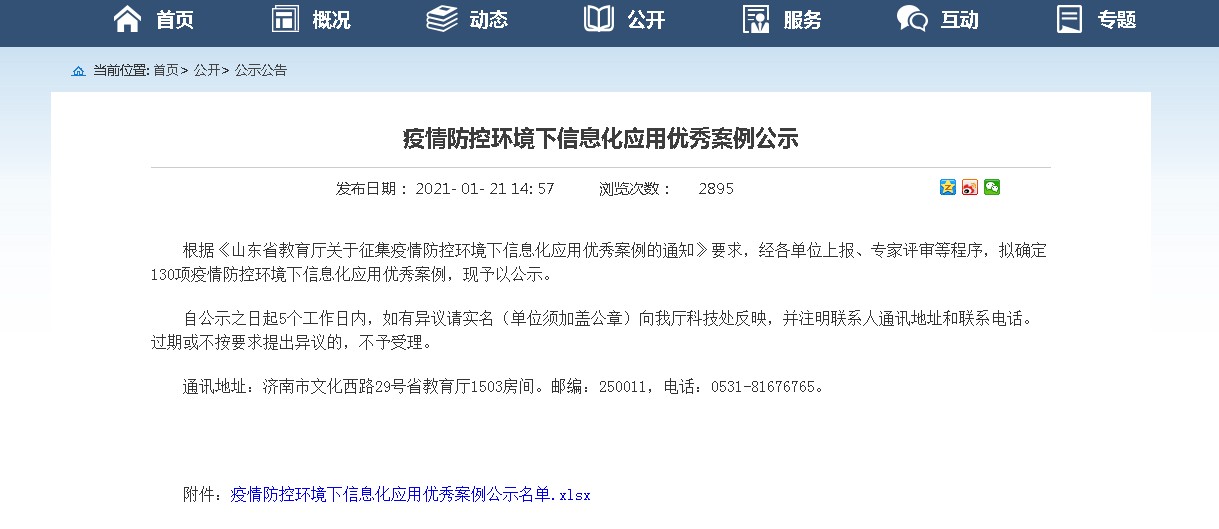 2021年1月21日,山东省教育厅公布了130项疫情防控环境下信息化应用优秀案例,其中威廉希尔官网提交的